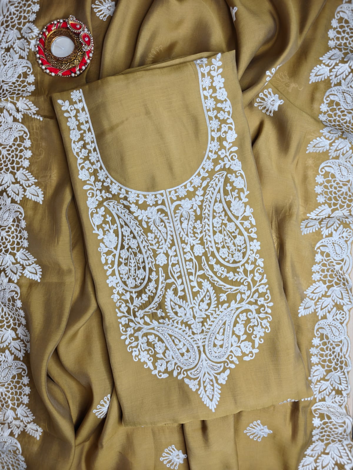 This beautiful unstitched suit set features a mustard-hued fabric adorned with delicate white thread embroidery across the neckline and front panel. The intricate floral and paisley motifs showcase fine craftsmanship, giving it a graceful and elegant appeal.