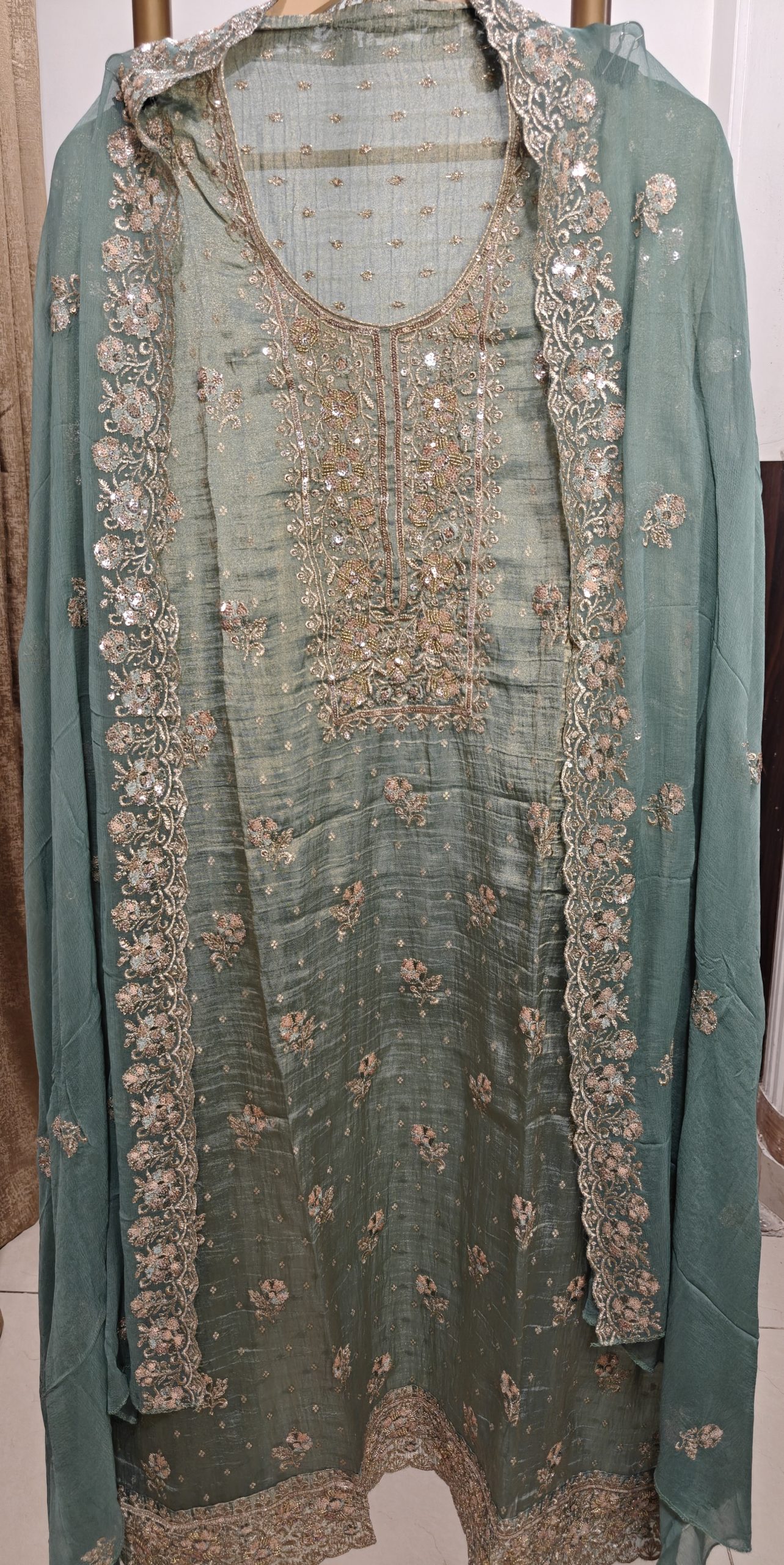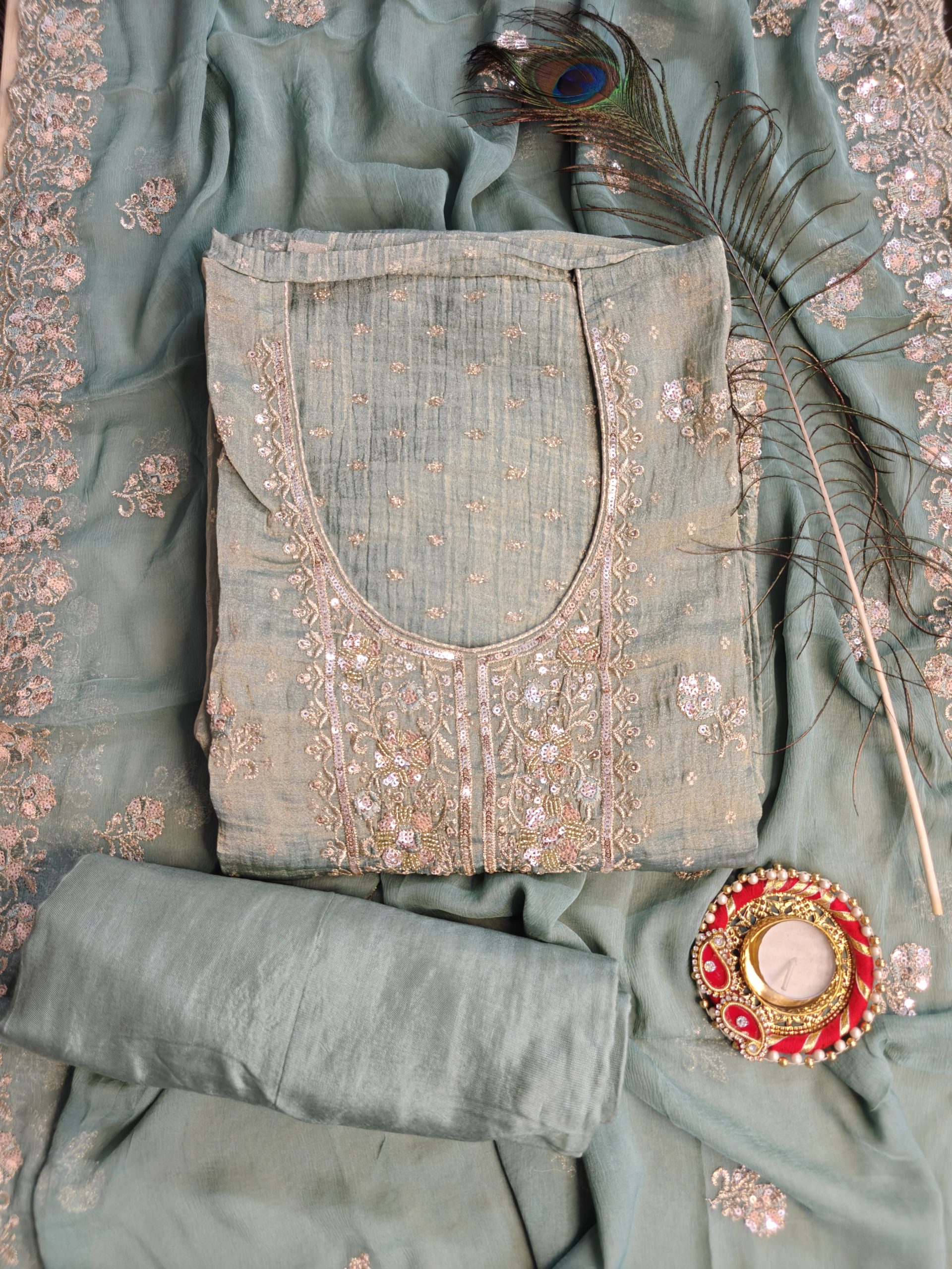 A stunning pastel teal green unstitched suit set crafted in a soft, flowy fabric with an elegant sheen. The kameez (top) features intricate mirror work and delicate floral embroidery in silver and pastel tones, especially highlighted along the neckline and front panel. The dupatta is beautifully finished with embroidered floral borders and scattered motifs throughout, giving it a regal yet subtle festive charm. The fabric for the bottom is kept plain to balance the heavy embroidery, allowing you to style it as per your comfort.
