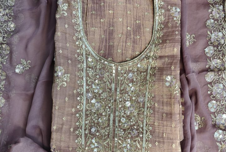 Luxurious Crush Tissue Suit in a striking Ruby Red/Magenta tone. Features a dense gold foil print and heavy hand embroidery along the front, detailed with glittering sequins and cutdana work. The neckline is highlighted with delicate mirror work. A perfect, high-glamour look for any festive occasion.