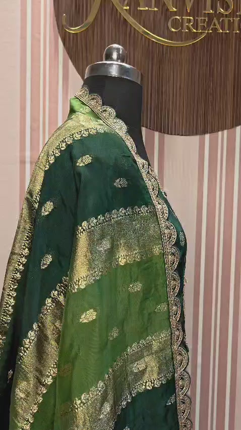 This is a sophisticated Bottle Green Banarasi Silk Suit Set, a classic choice for weddings, festive occasions, or formal celebrations. It blends traditional craftsmanship with a modern silhouette.