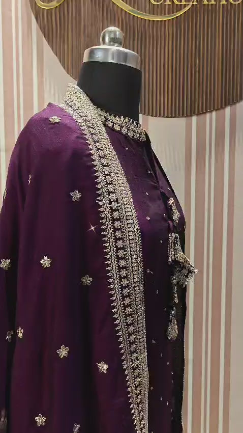 Exude timeless grace with this exquisite 3-piece ensemble from Kanvisha Creations. Crafted from premium Chinon Silk, this suit features a deep plum-purple hue that radiates sophistication. The set is beautifully detailed with delicate silver-toned thread work and a distinctive tasseled neckline, making it an ideal choice for festive celebrations, weddings, and evening soirées.