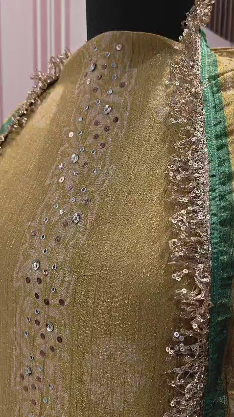 Fabric & Texture: The ensemble is crafted from premium Crush Shimmer fabric, which features a delicate micro-pleated texture and a subtle metallic sheen that adds depth to the outfit.